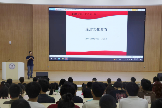 学院党总支书记吴浪平对2023级新生进行了廉政(洁)文化教育,吴浪平书记引经据典将廉政(洁)教育与清廉校园活动结合起来,实现了廉政(洁)教育的全覆盖,强化了新生的廉洁守法意识。