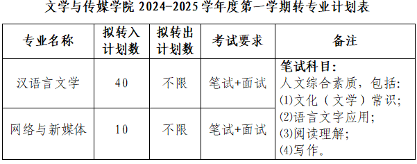 我院今年有汉语言文学、网络与新媒体本科专业接受我校学生转专业申请。基本条件按照《荆楚理工学院学生转专业实施细则》(荆理工教〔2017〕14号)规定执行。专业转入条件如下: