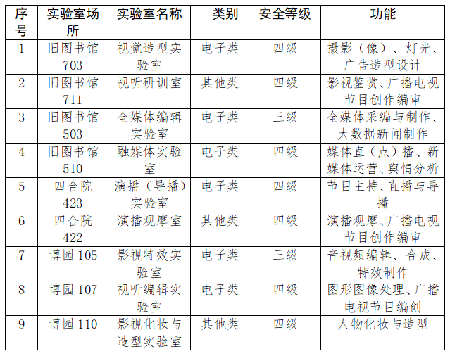 夜插内射视频网站-传媒实验(实训)中心设备涉及电子类和其他类两种类别,主要有摄影摄像、灯光照明、电子计算机类设备。其中灯光照明类、电子计算机类实验室安全风险主要为用电安全,其他类的安全风险主要为防火、防潮。全媒体编辑实验室和影视特效实验室安全等级为三级,其它实验室安全等级均为四级。