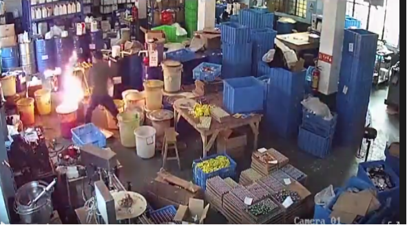 事故原因:该厂生产车间乱摆乱放,生产原料属于易燃品,员工违规操作起火,该起火灾发生初起的视频显示,发生火灾后,灭火器就在旁边,员工却不知使用,竟用嘴吹、纸板扑打、覆盖塑料桶等方法灭火,最终小火酿大火,造成19人死亡。