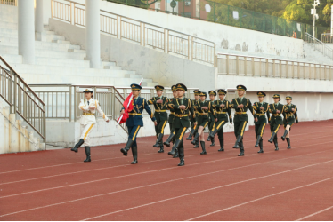 七点整,升旗仪式正式开始。英姿飒爽的国旗护卫队迈着整齐划一的步伐,护送鲜艳的五星红旗来到国旗台下。伴随着庄严肃穆的国歌,鲜艳的五星红旗冉冉升起,在熠熠晨光中迎风飘扬。